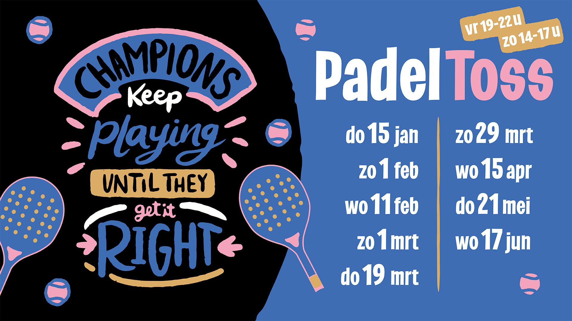 Tijdens de TOSS speel je wedstrijdjes van een half uur in steeds wisselende samenstellingen. Je kunt alleen komen of samen met je padel- of tennismaatjes. Introducees zijn uiteraard ook van harte welkom.