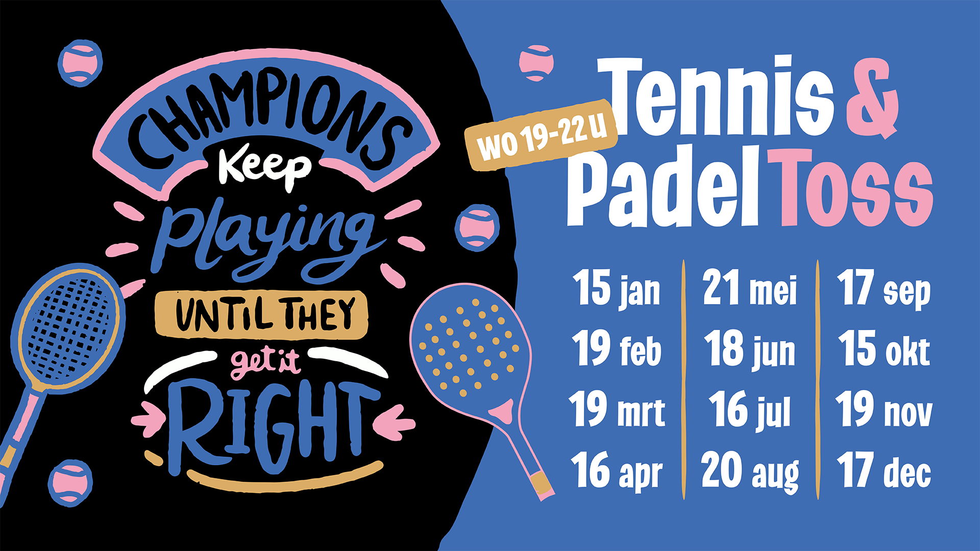 Soms heb je dat: Wil je even tennissen of padellen, maar dan mis je een maatje. Maar niet getreurd, een flink aantal keren per jaar kun je naar de Toss komen zonder maatje. Tijdens de Toss speel je eens tegen mensen die je misschien niet zo vaak ziet. Kom wanneer het jou uitkomt. We wisselen elk half uur door. Bij veel animo kan het zijn dat je af en toe een ronde overslaat, maar dan is het extra gezellig in de kantine. Ideaal moment om andere tossers te leren kennen (en misschien wat telefoonnummers uit te wisselen 😉).